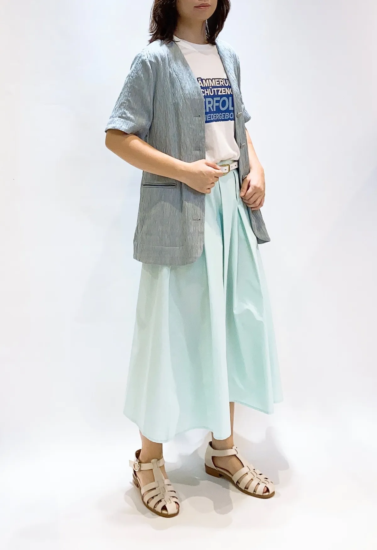 .標準肩線,帶有些微彈性,合身不貼身的版型,長度約落至臀部