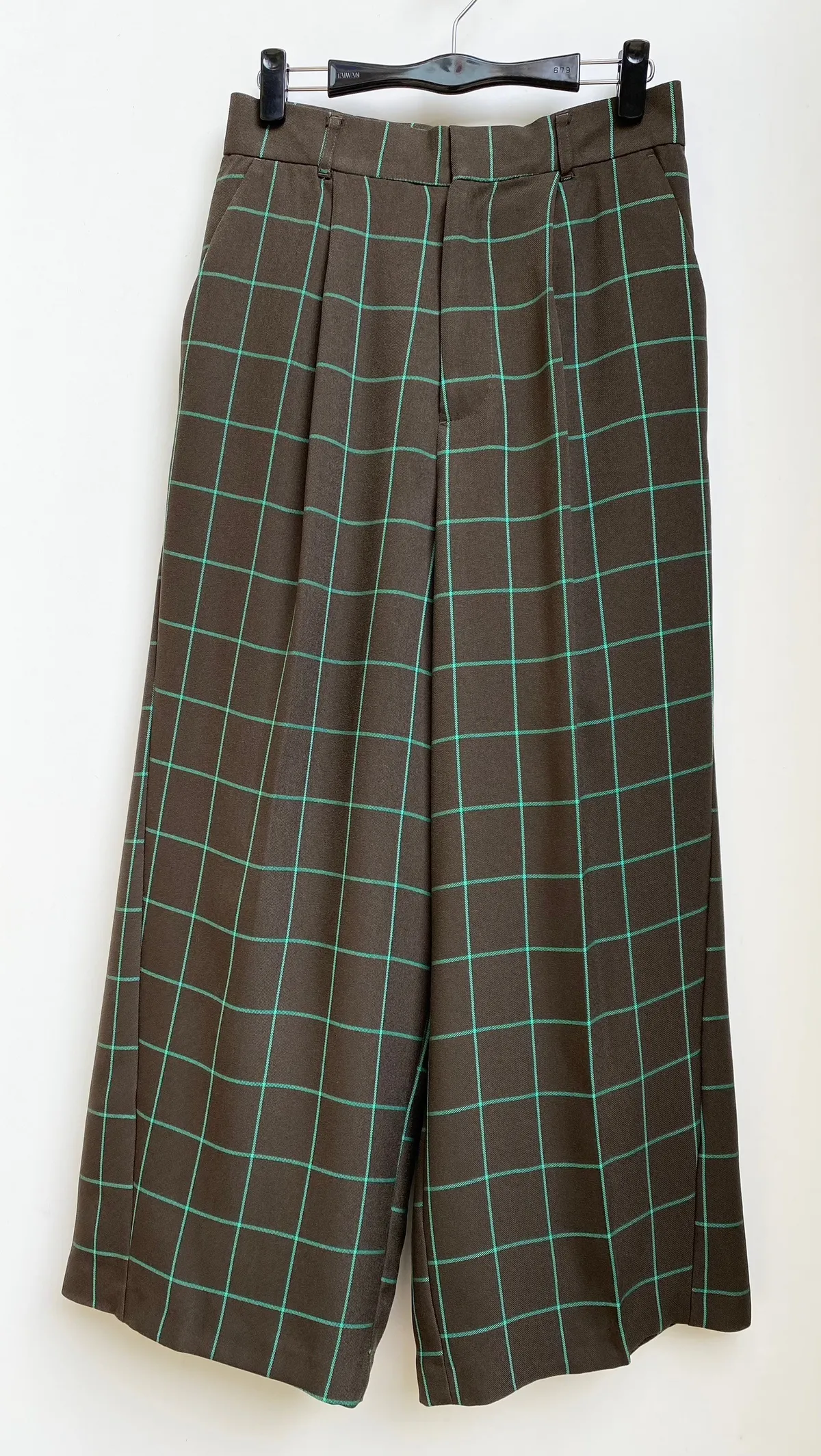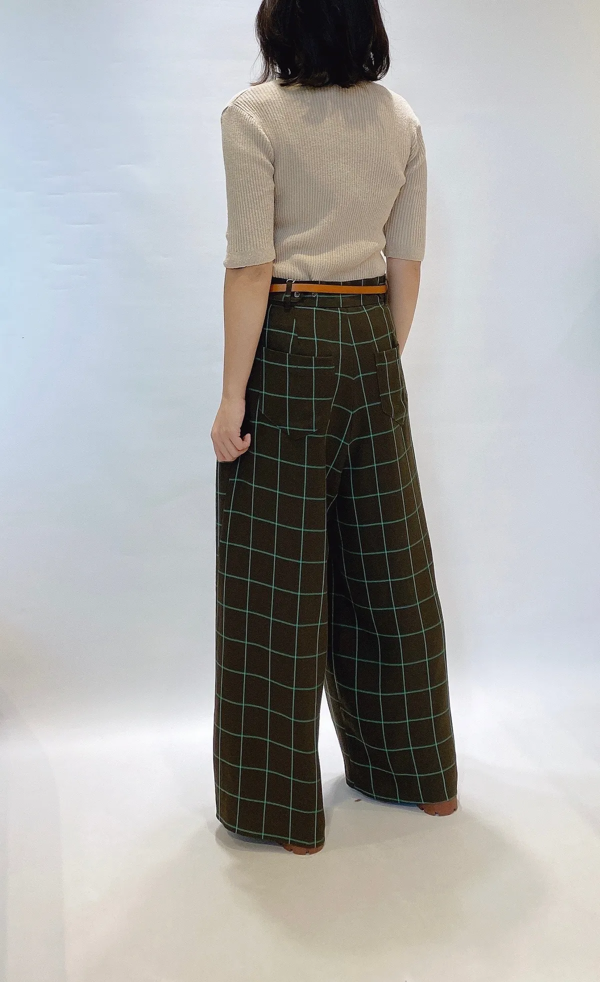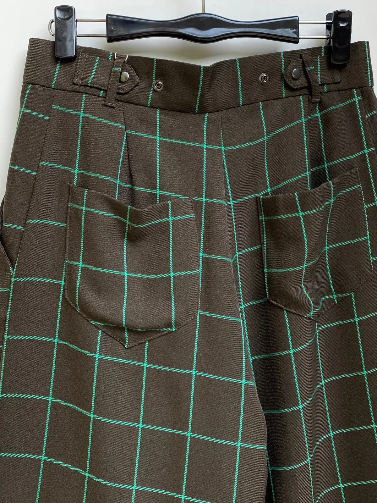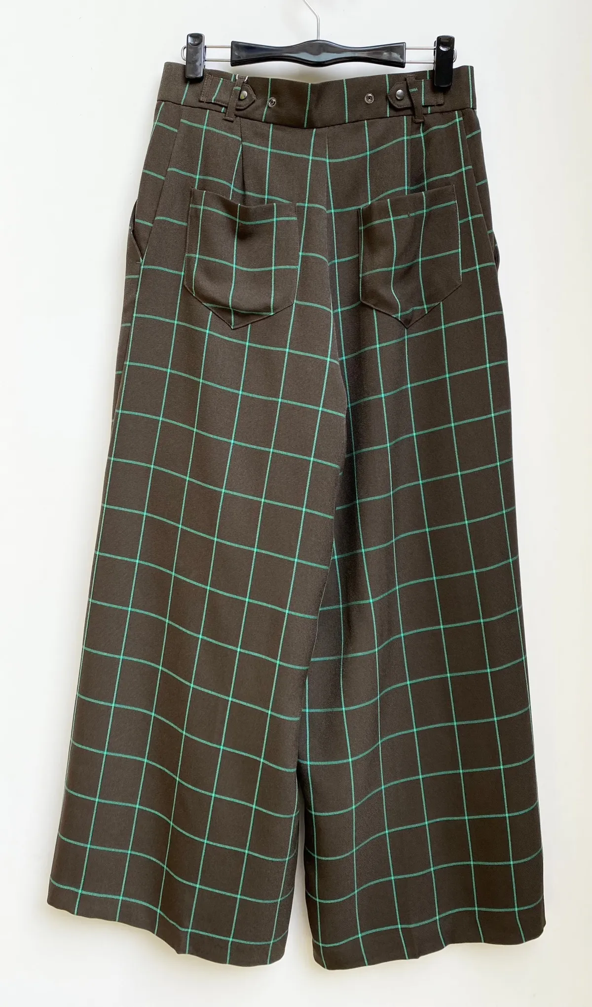 高腰後調節釦格紋寬褲