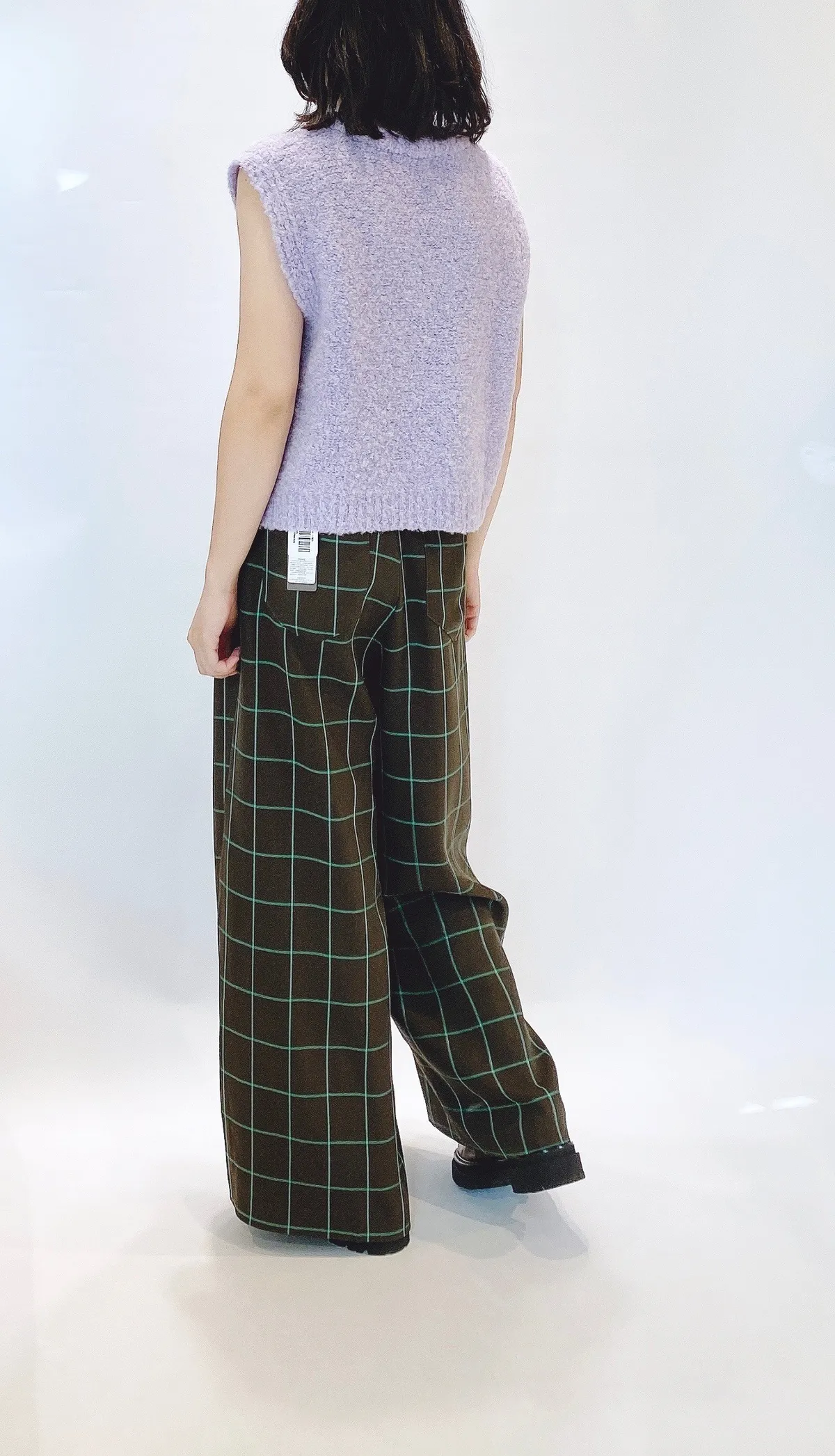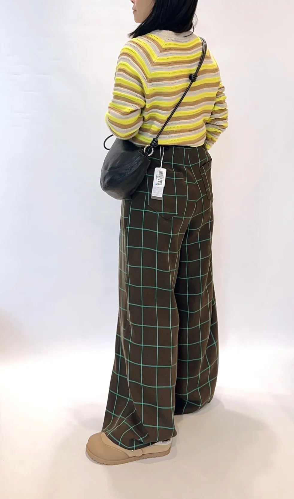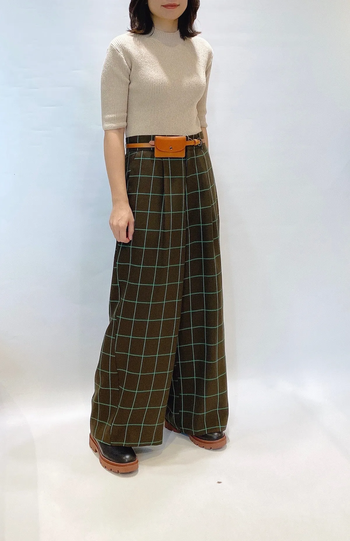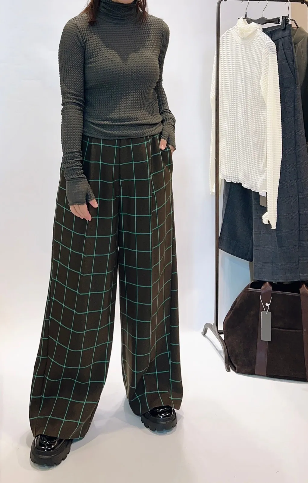 高腰後調節釦格紋寬褲