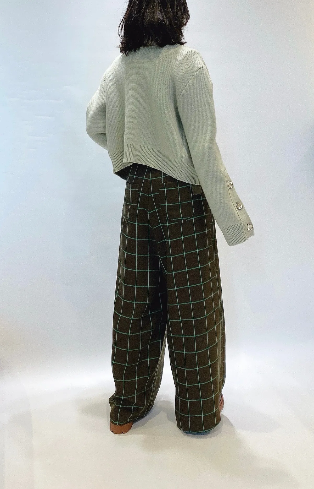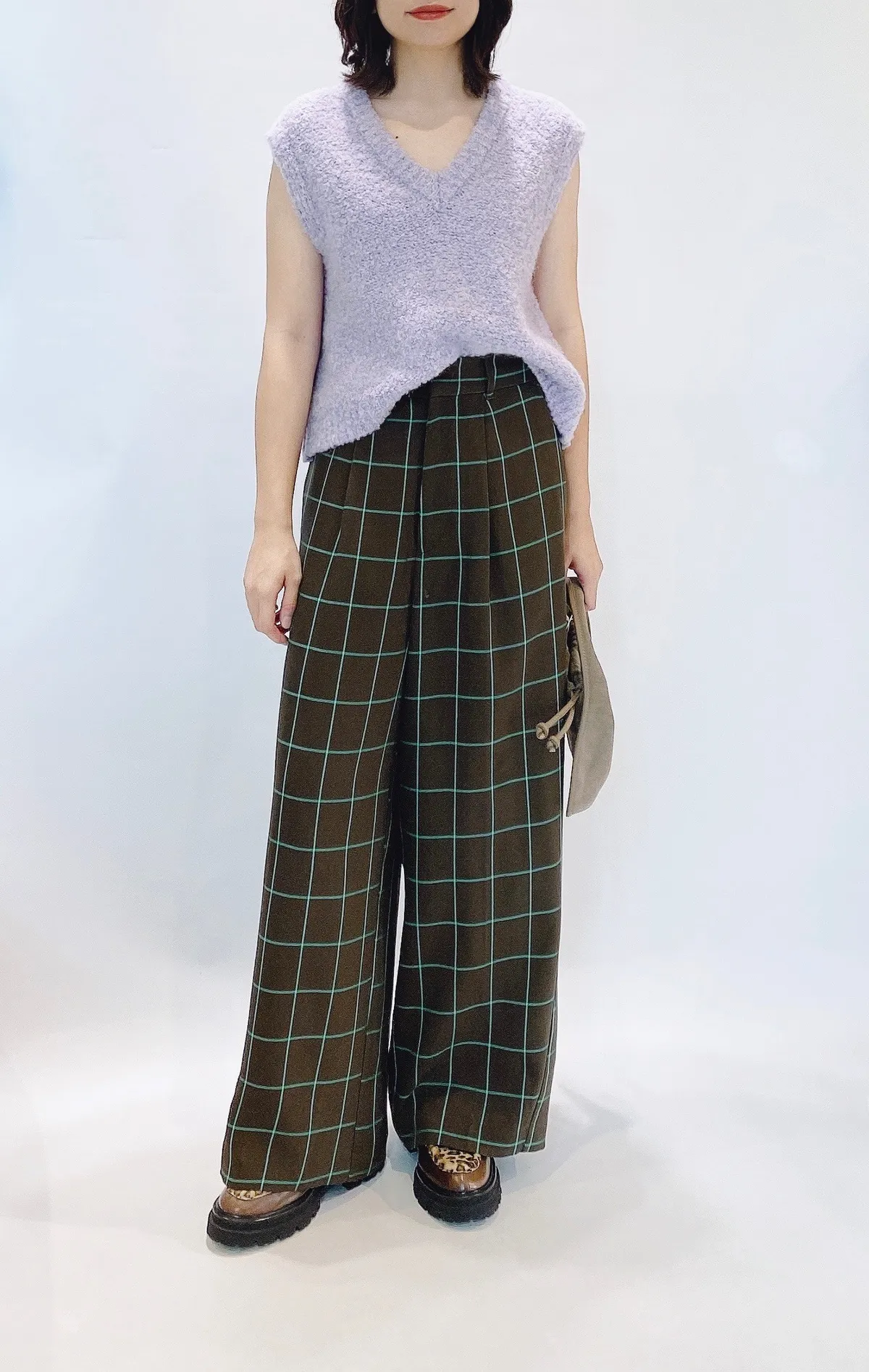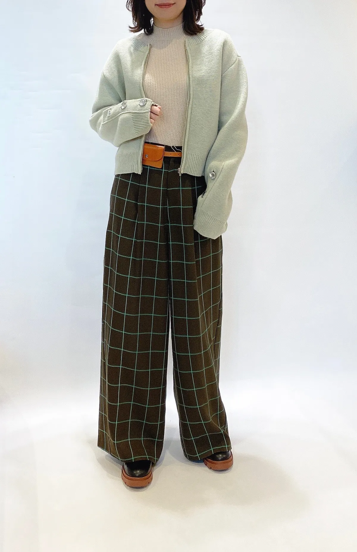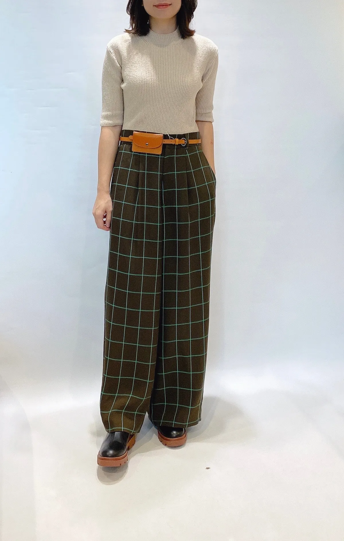 高腰後調節釦格紋寬褲