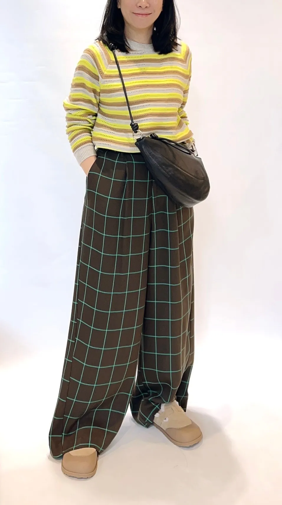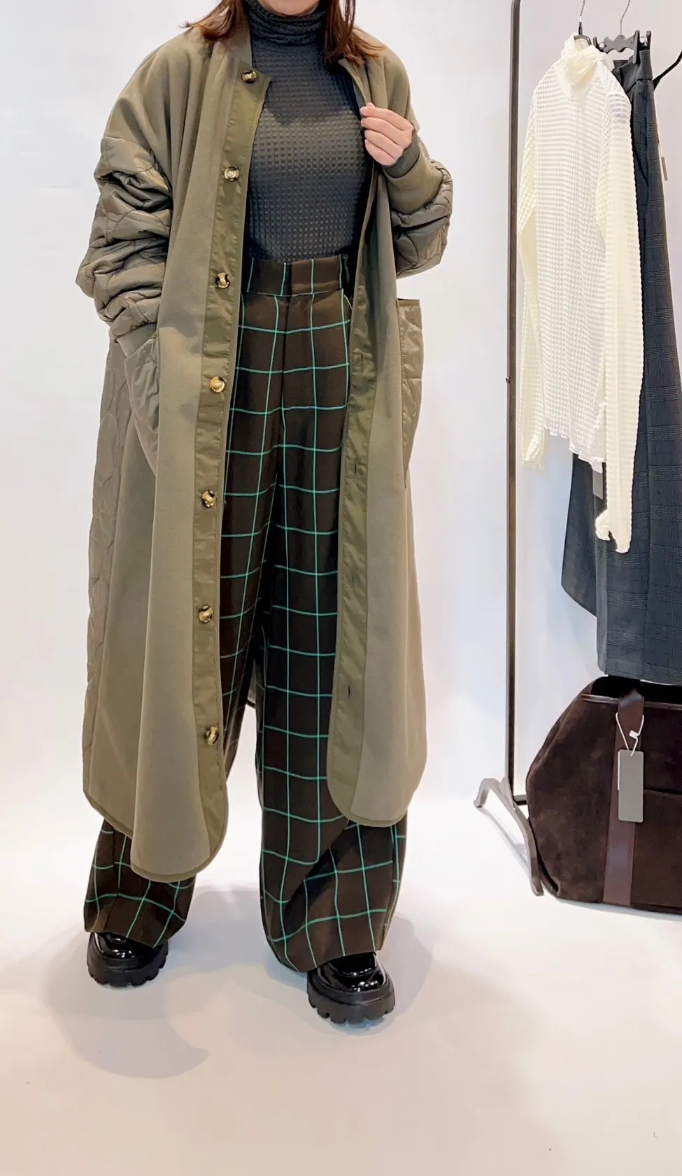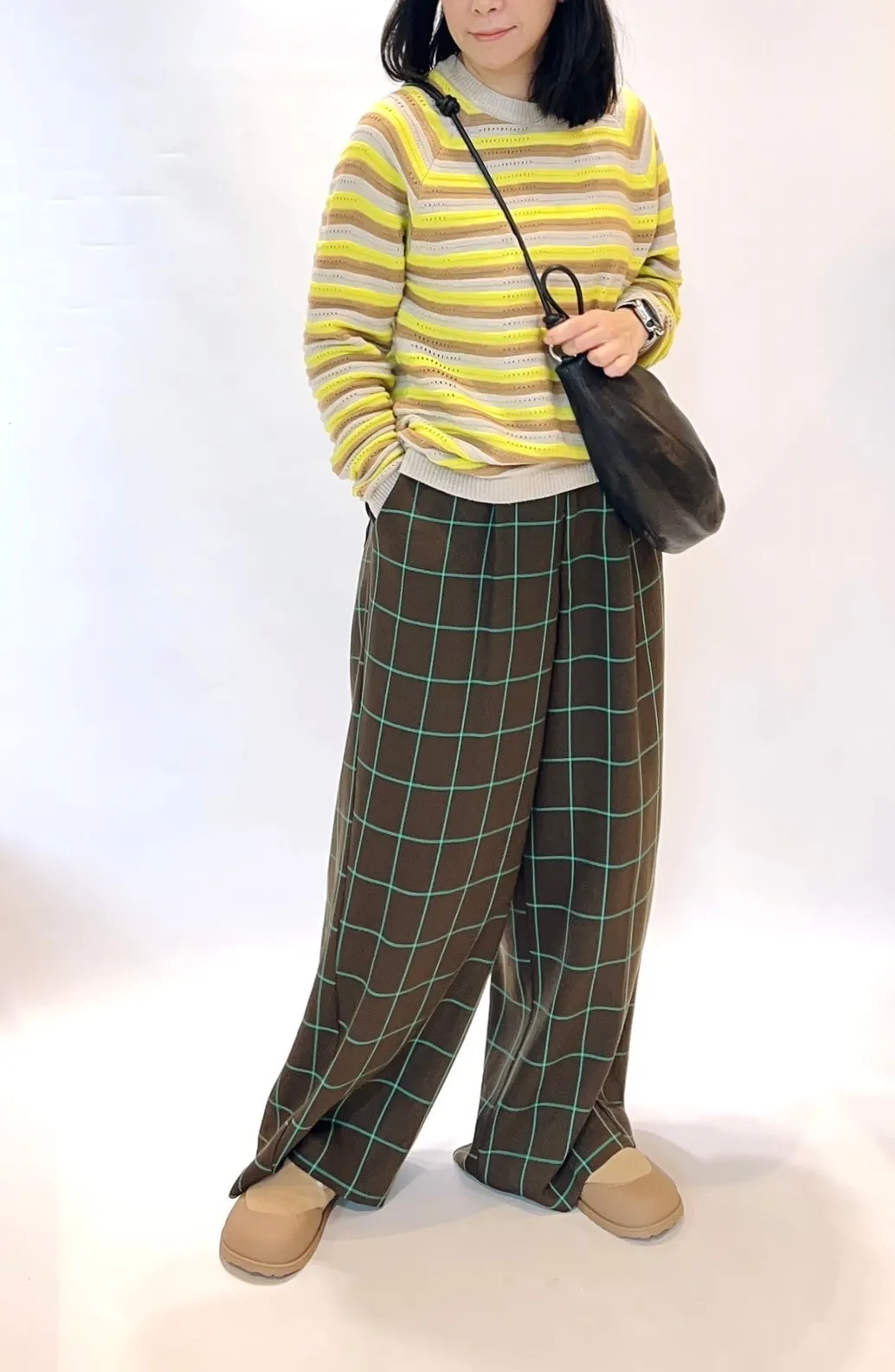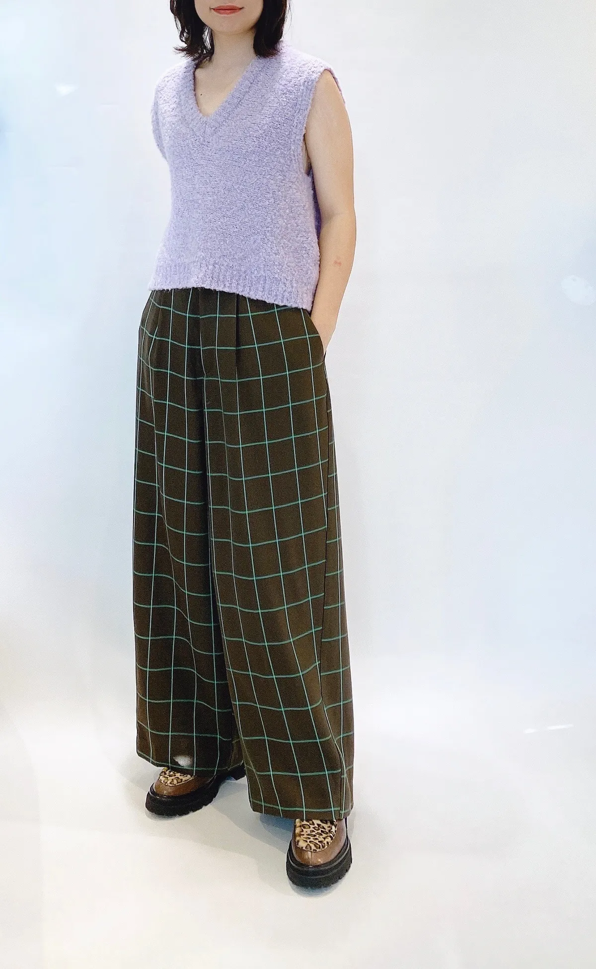 高腰後調節釦格紋寬褲