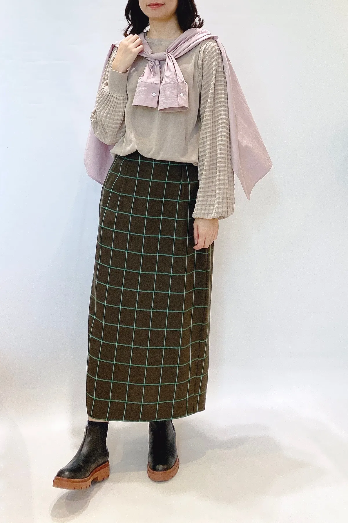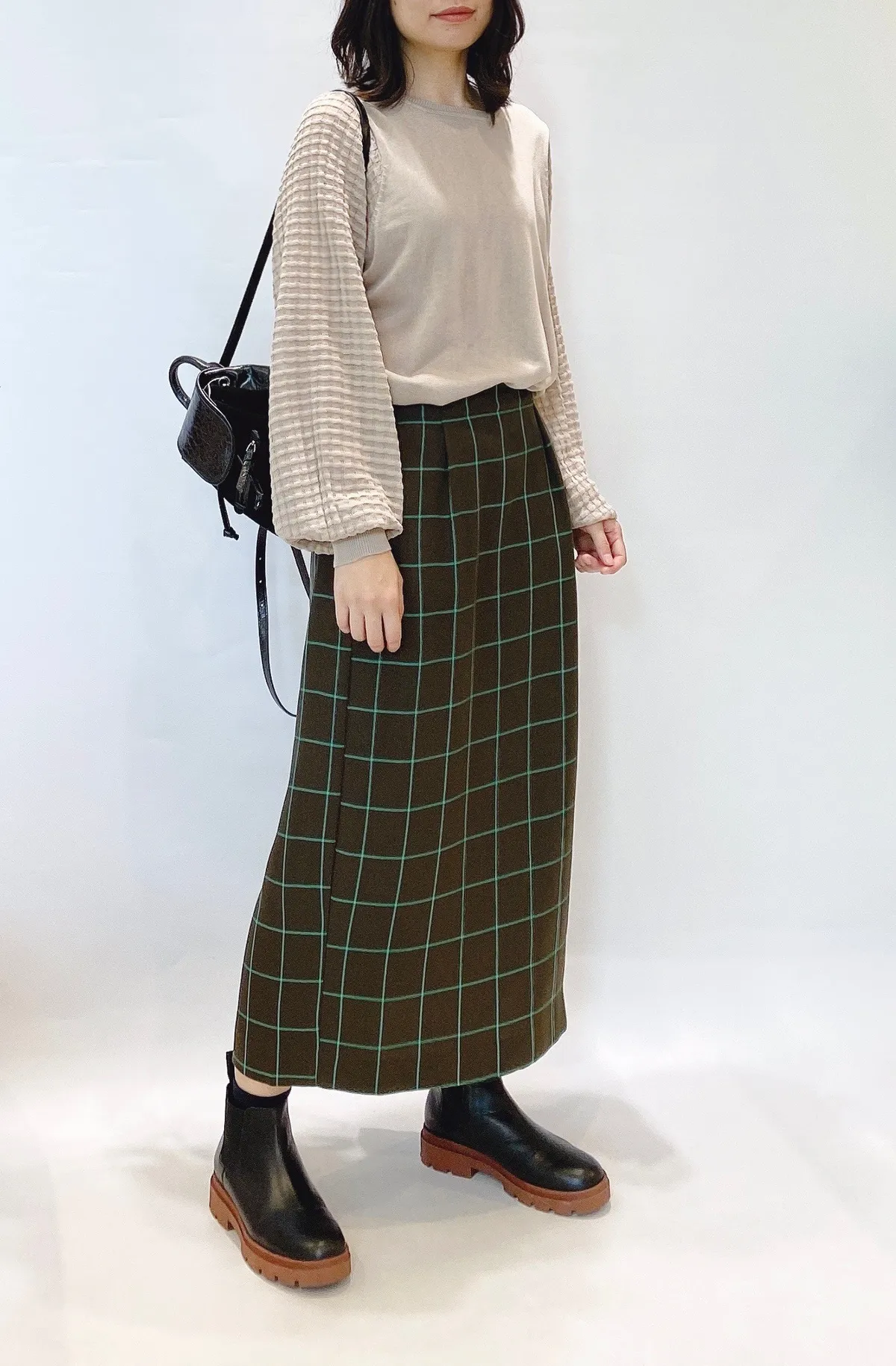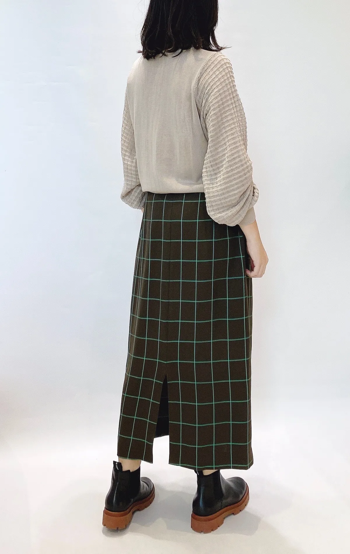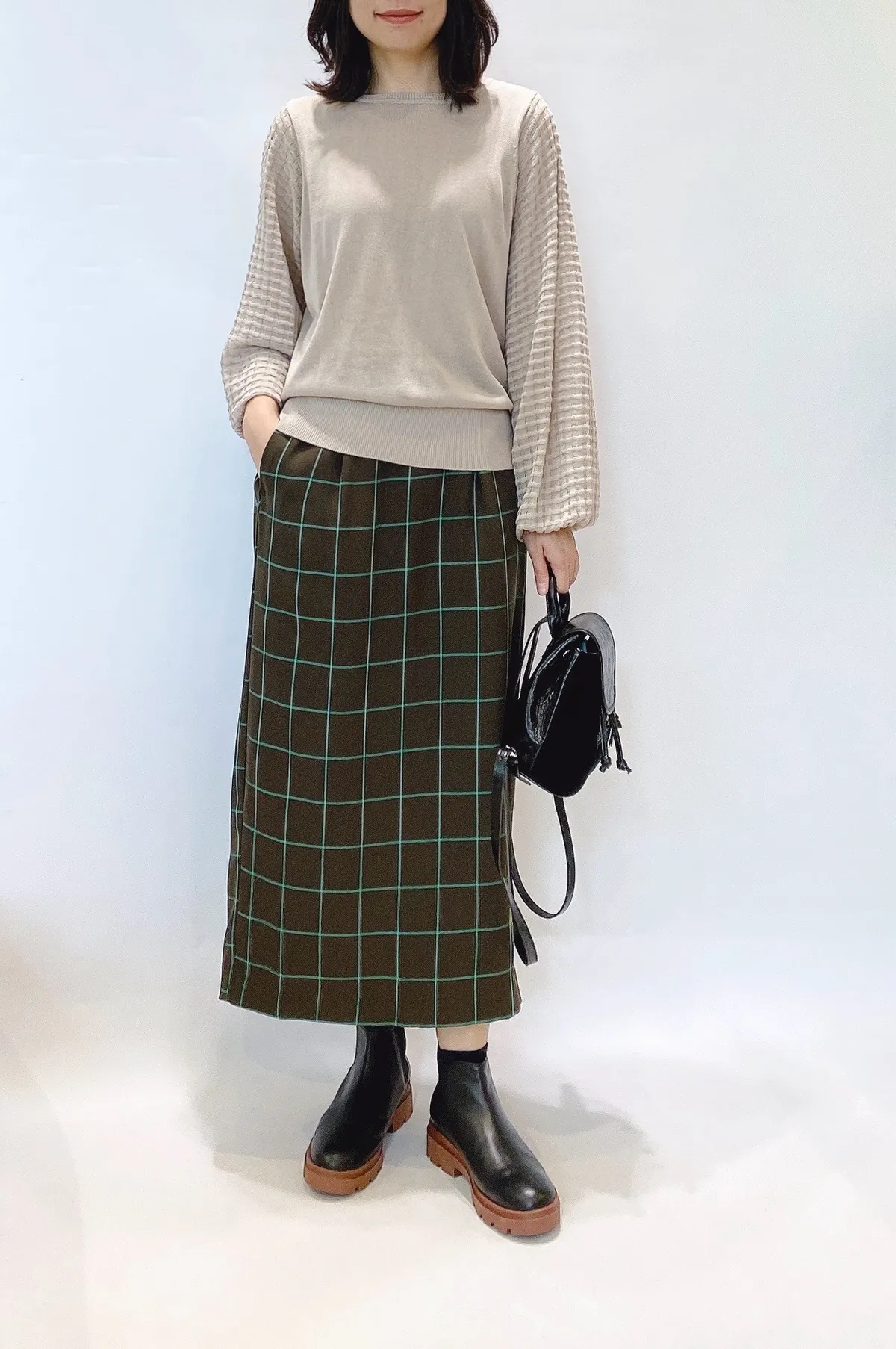 方格立體織紋拼接袖鉤花上衣