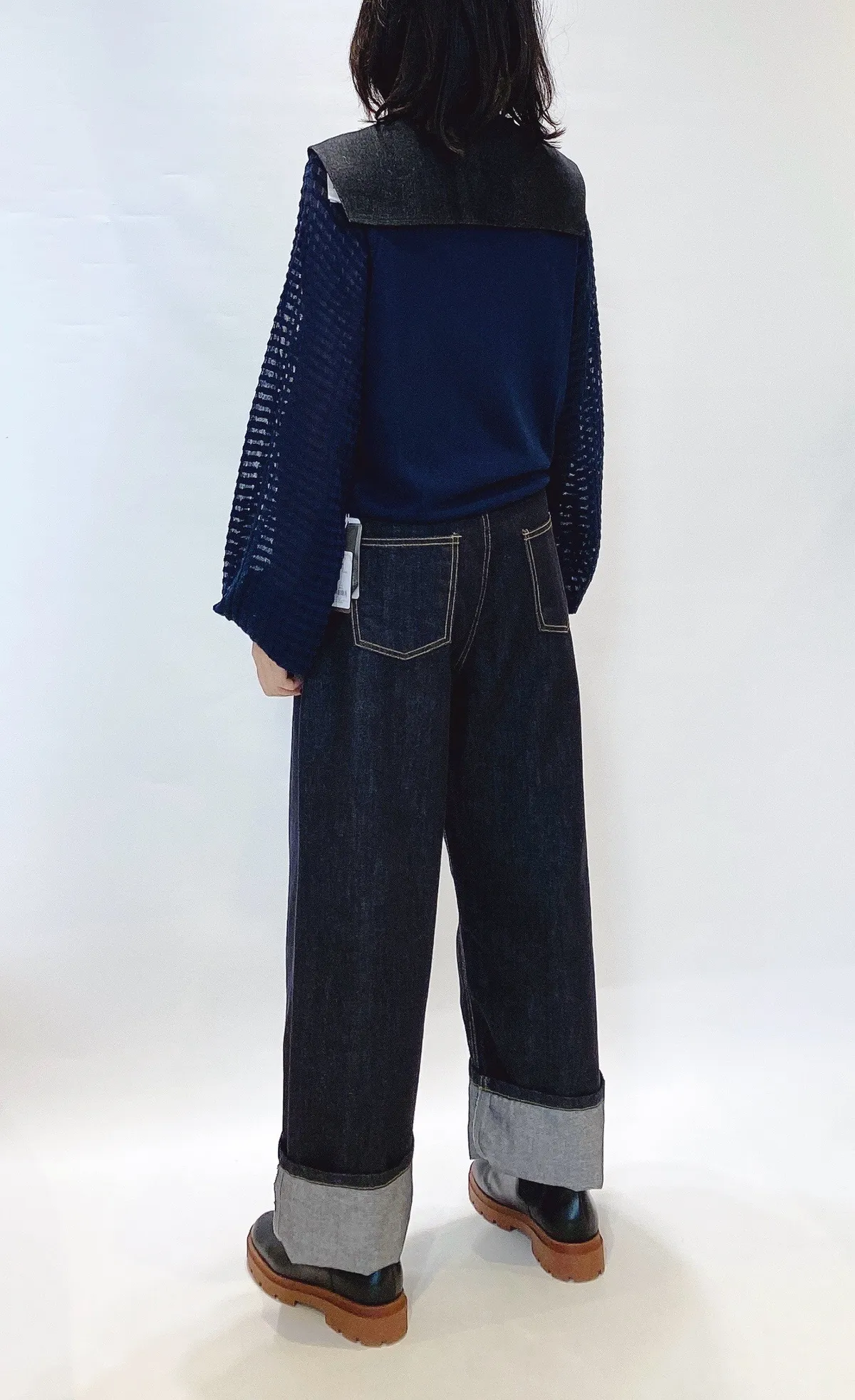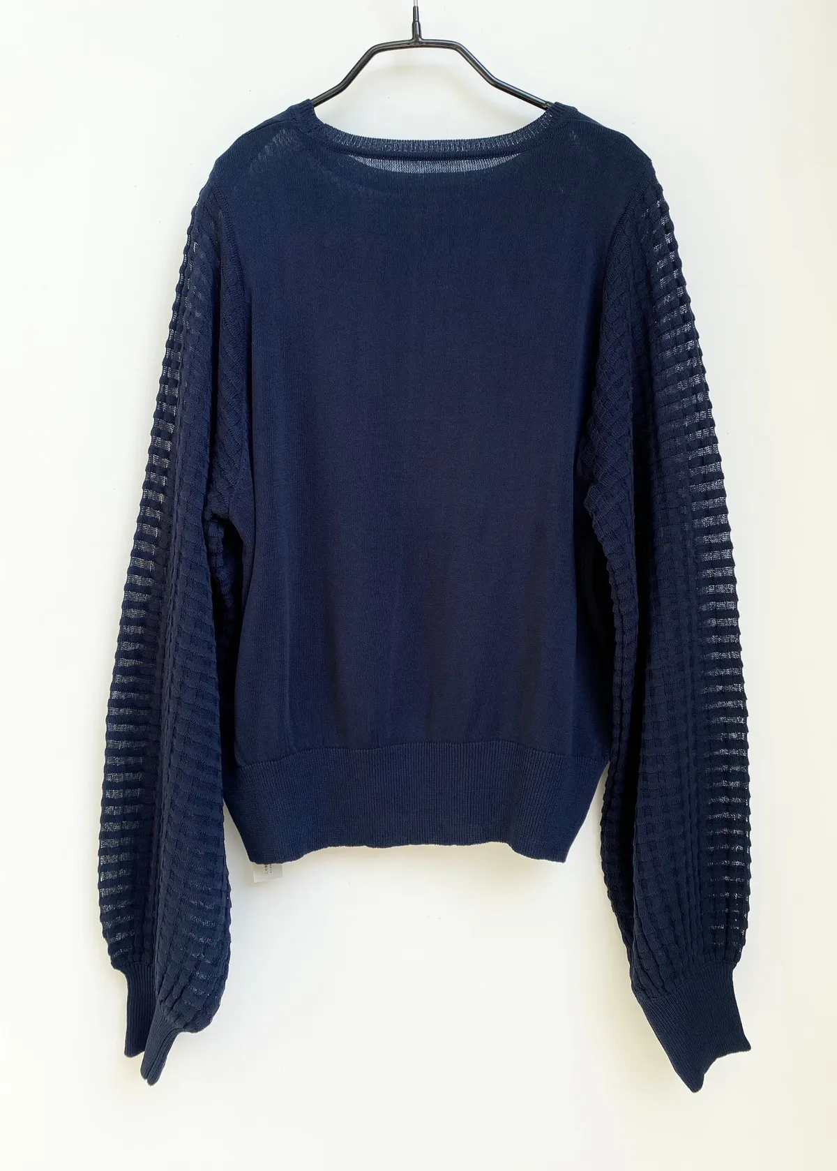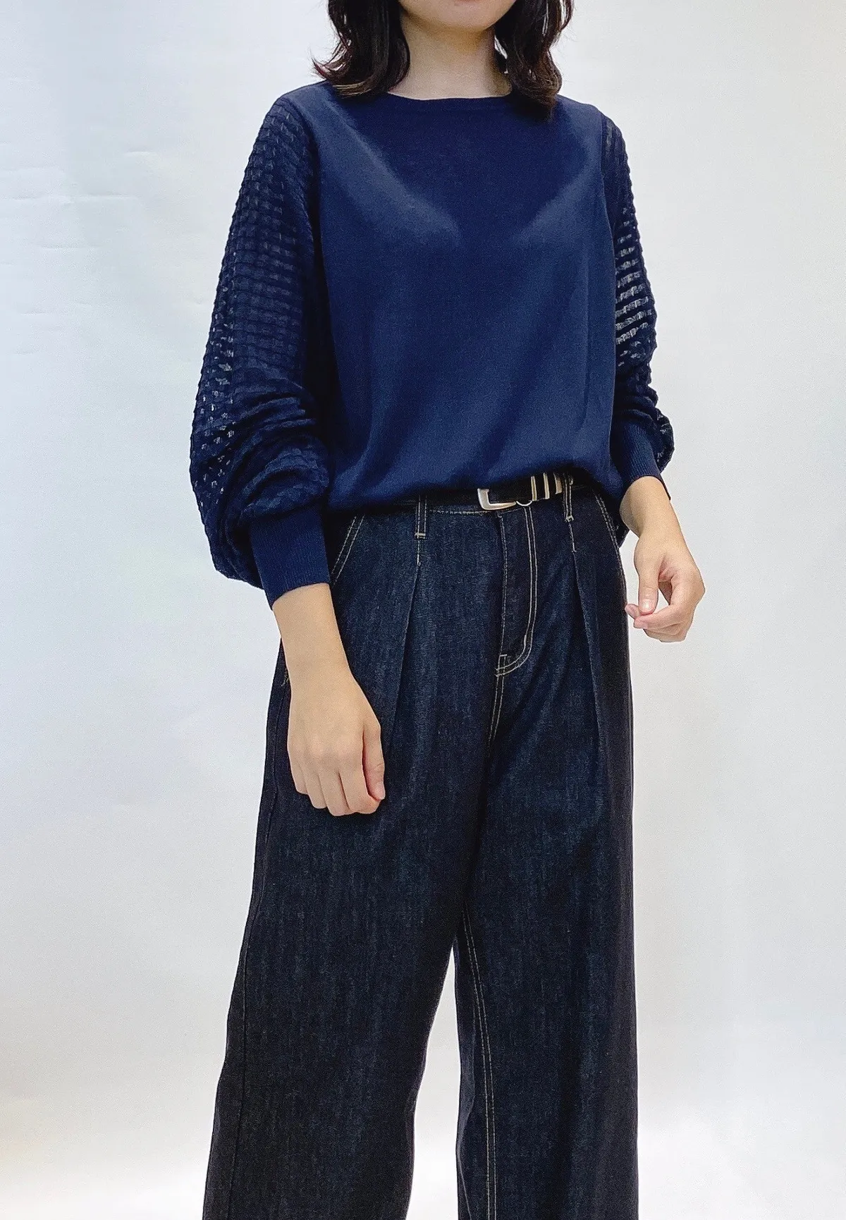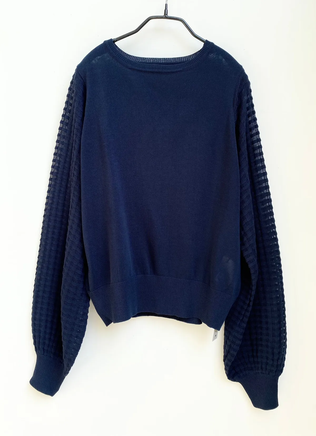 方格立體織紋拼接袖鉤花上衣