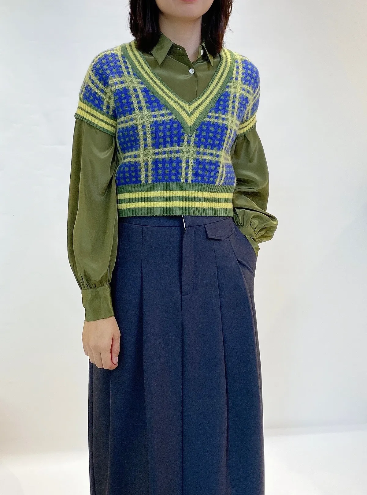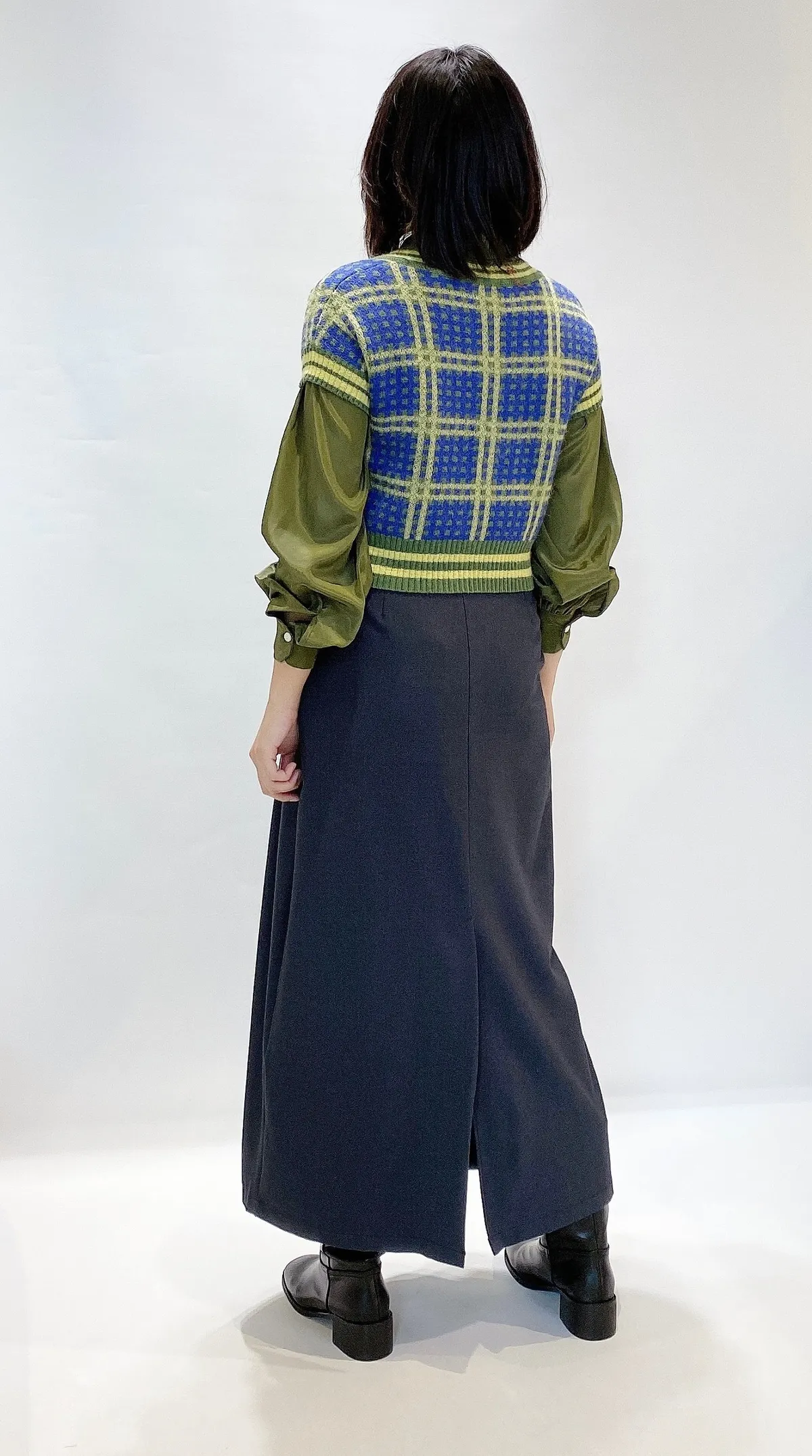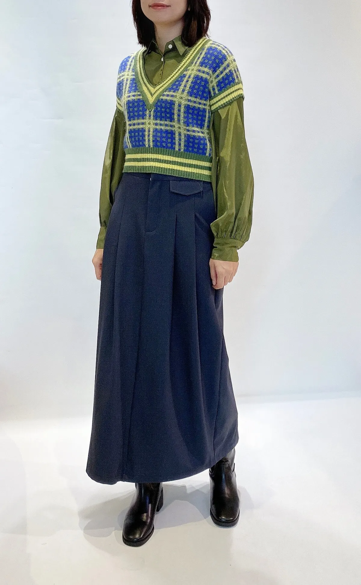 假口袋寬摺後開岔長裙