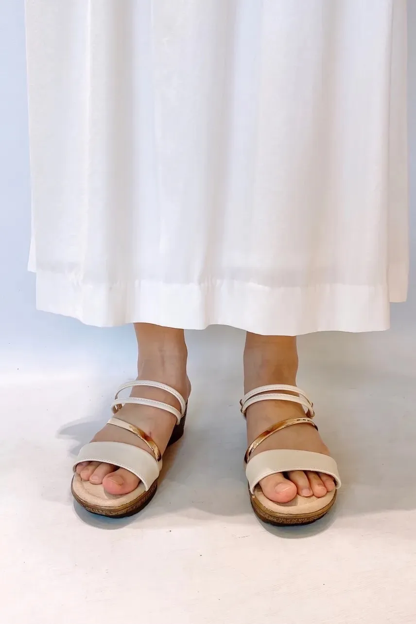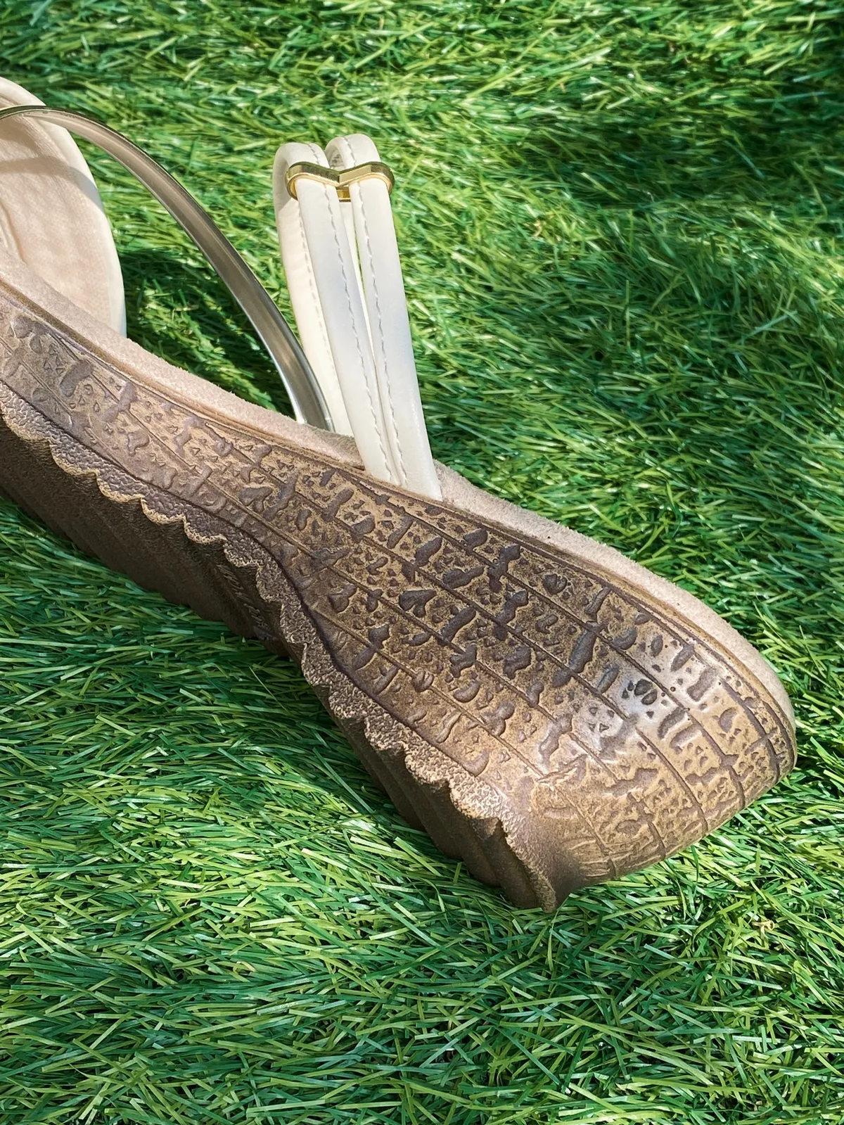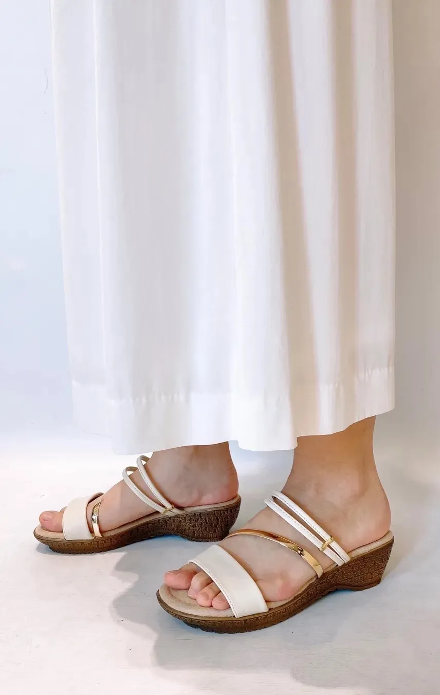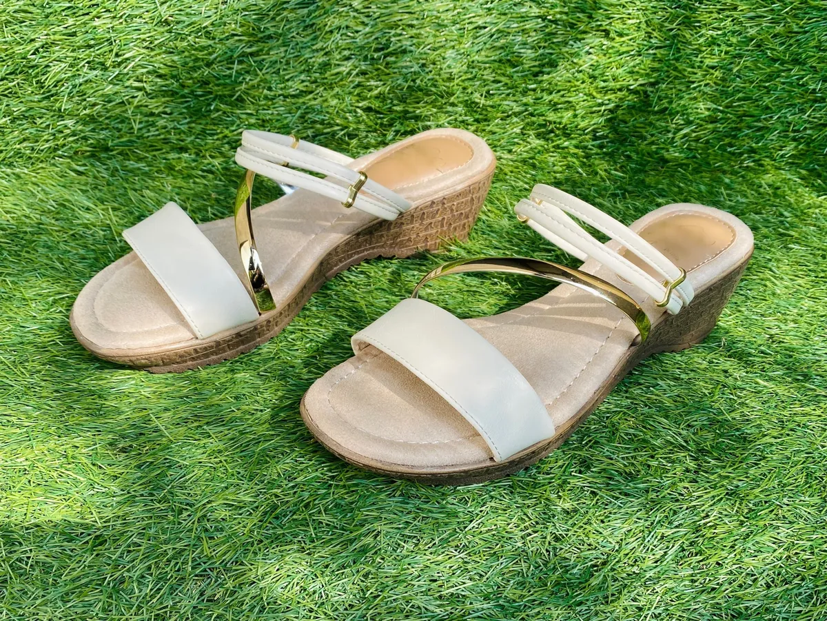 和一般常見的草編楔型鞋不同的地方在於,側邊紋路做的是較為獨特的凹凸滑面設計,增加了特色度以及細緻的質感,另外款式做有金屬面橫帶在鞋子整體為白色的色調上,原本氣質的風格因為有了不同的顏色交織,在上身的穿搭上可以呈現出率性和優雅的味道出來,非常適合平時喜愛穿淺色調的人做搭配,不論是裙裝或是褲裝的效果都會很有質感。