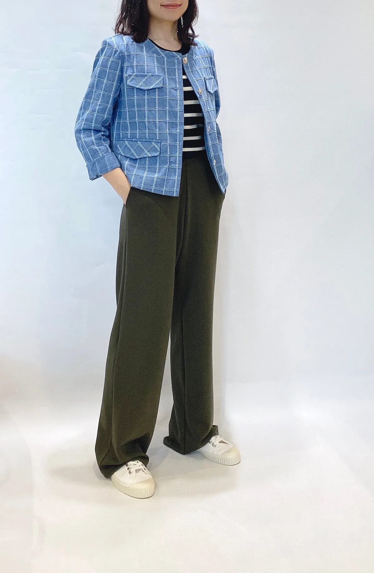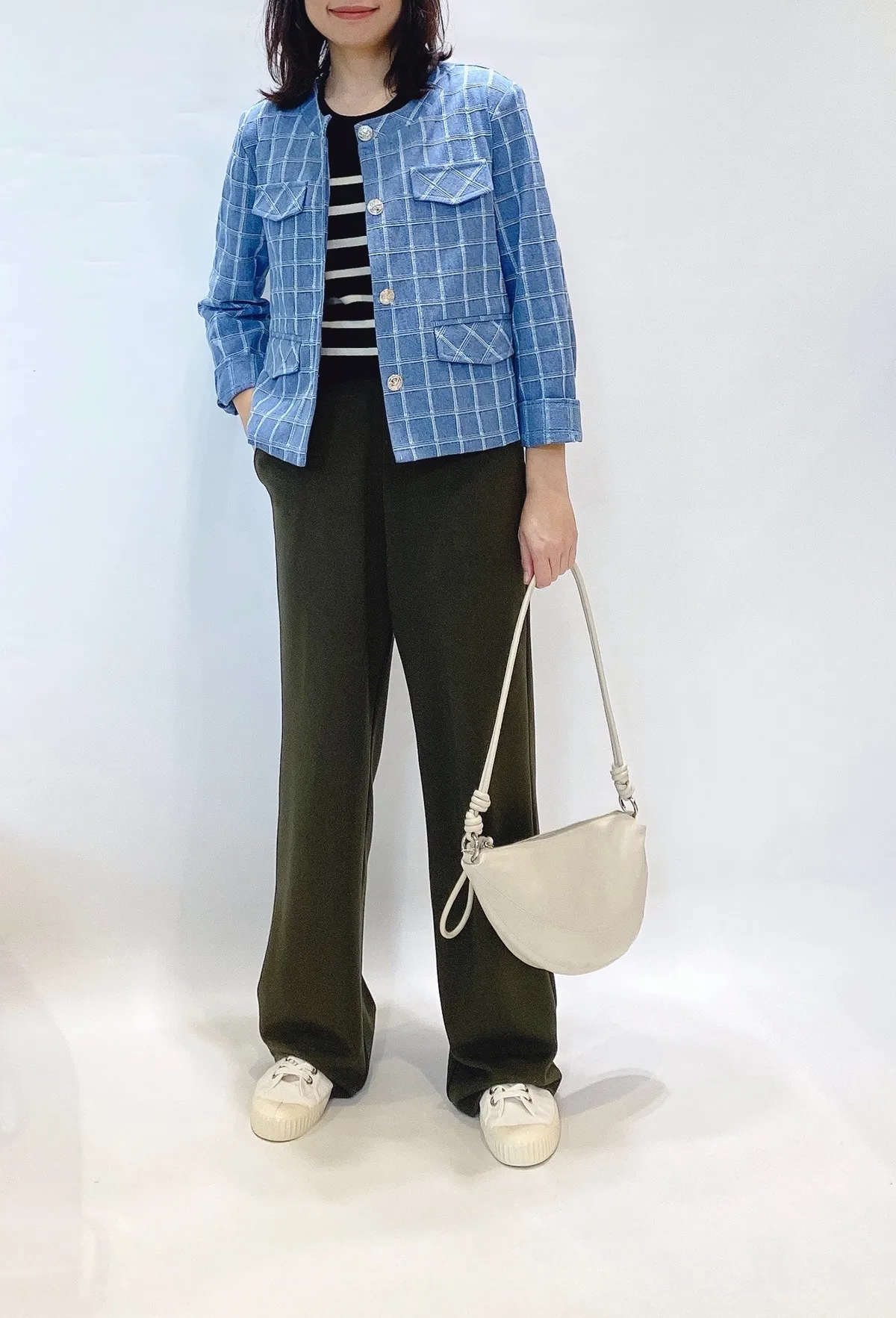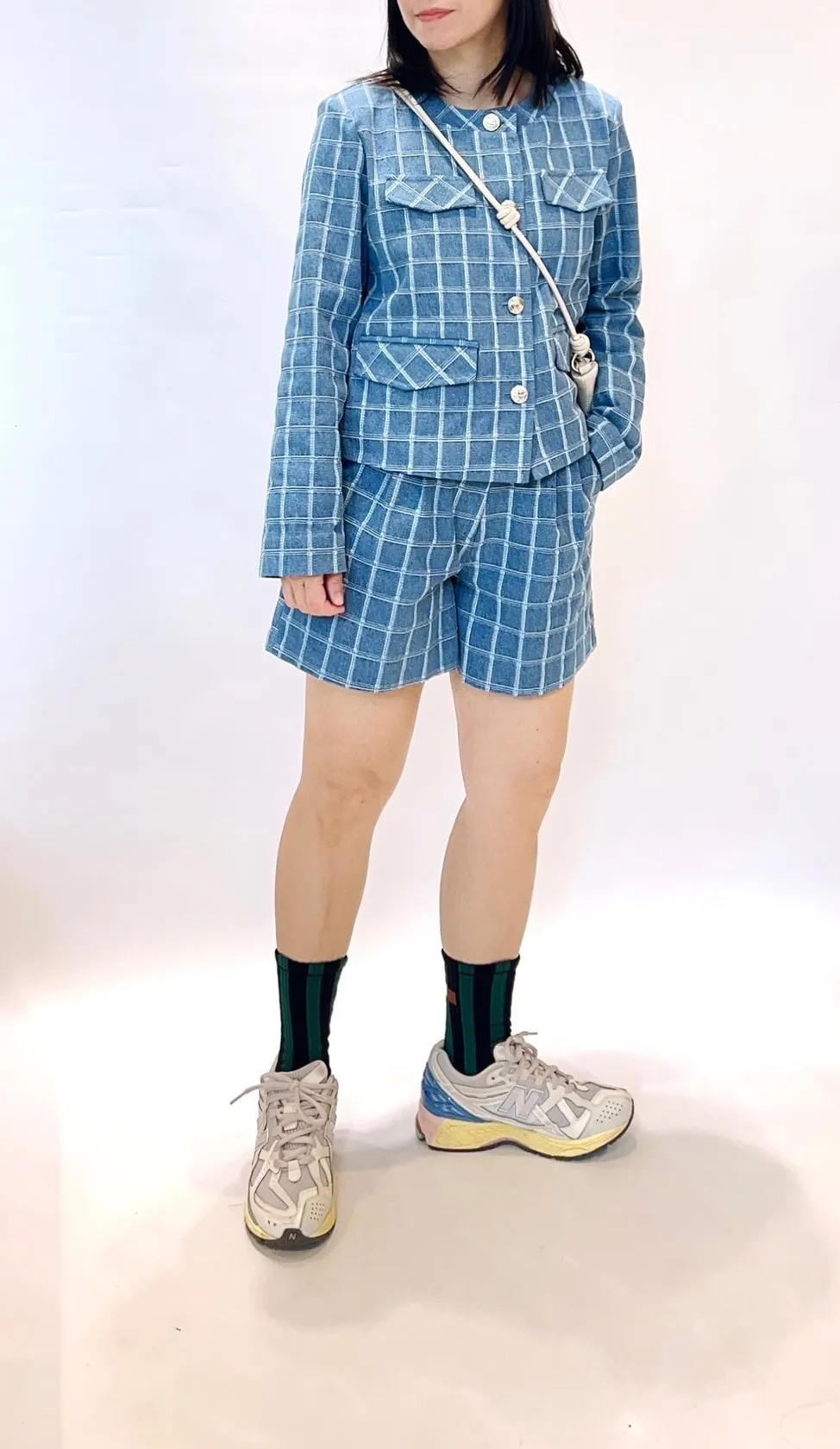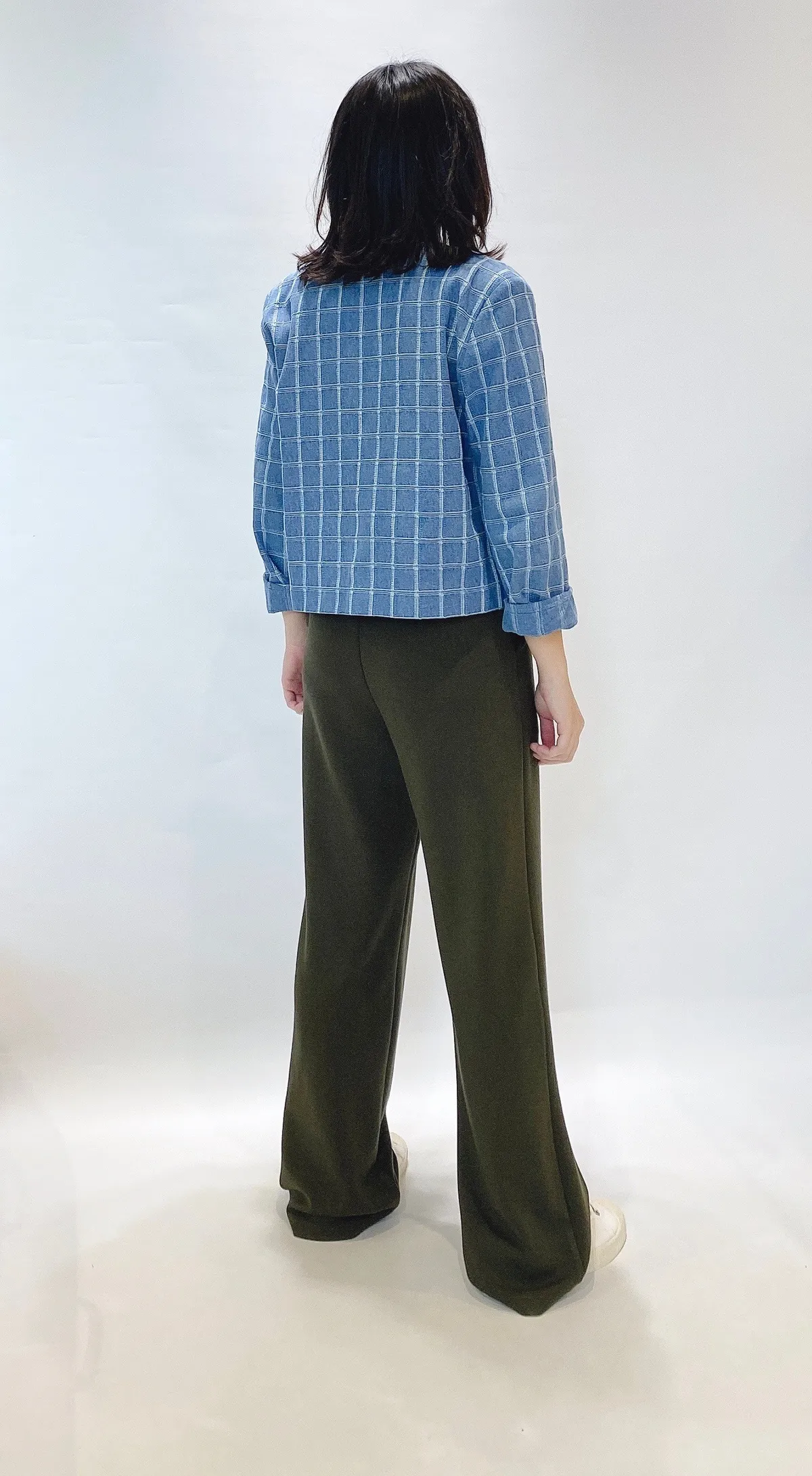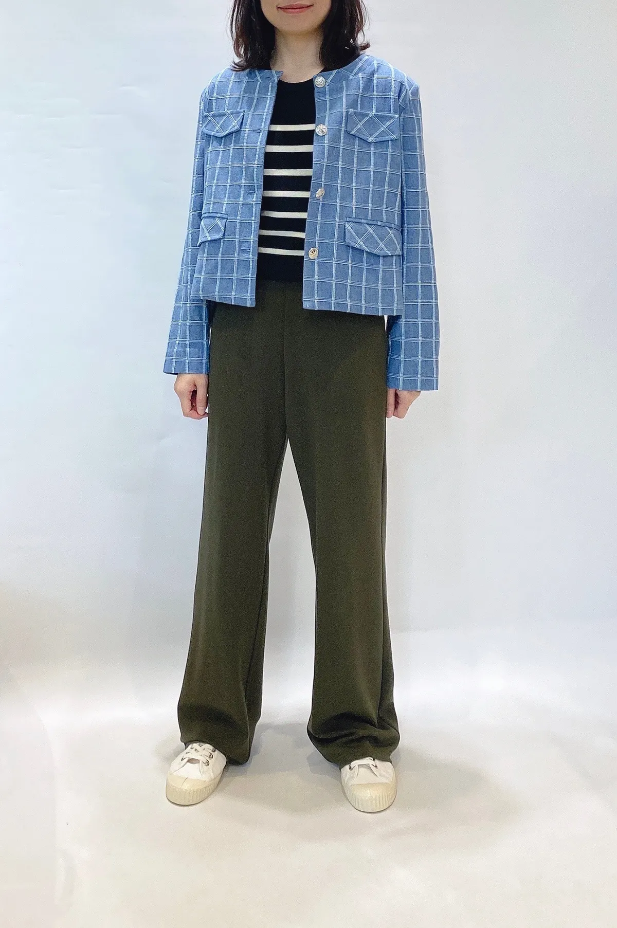 圓領格紋布面軟墊肩外套