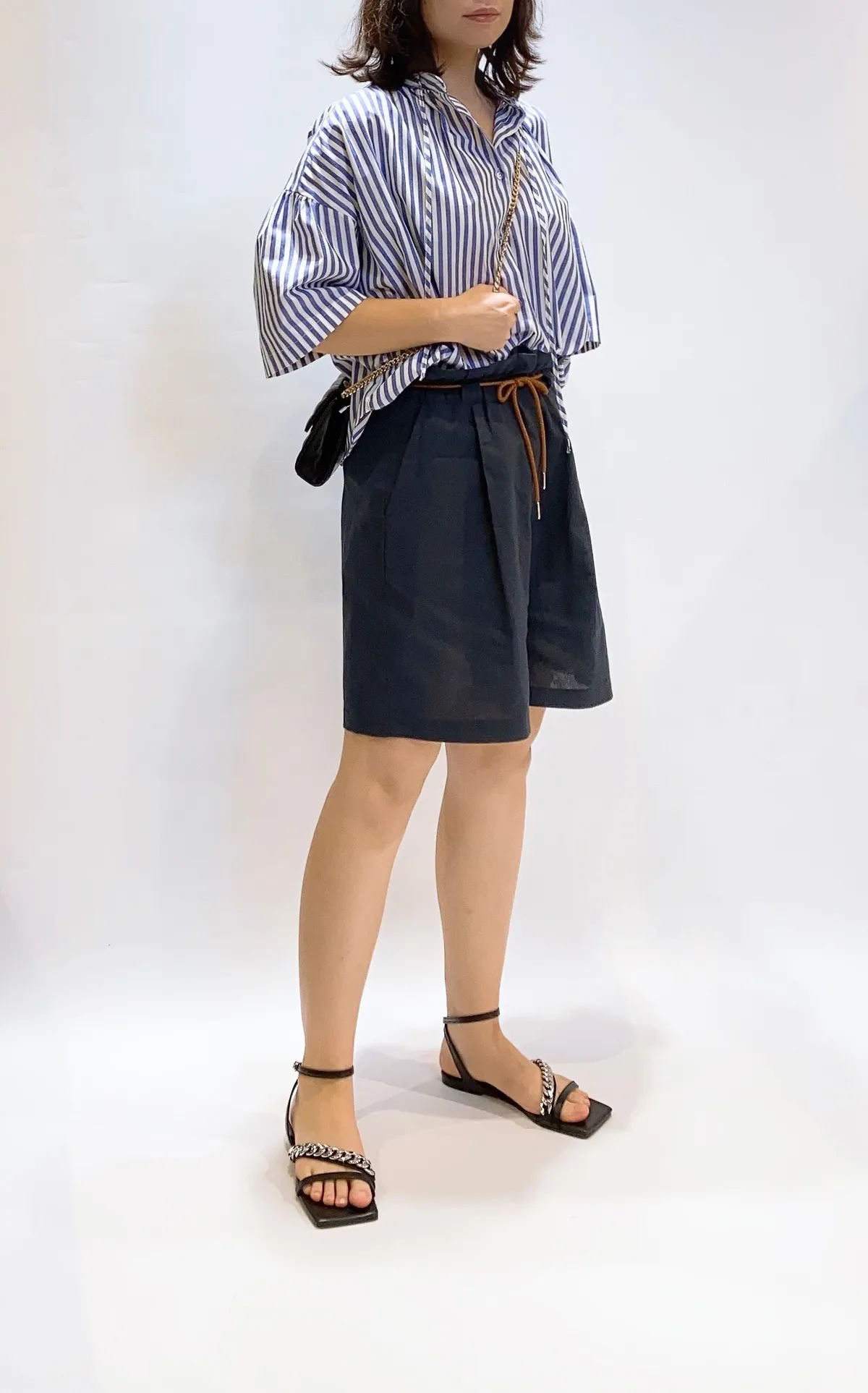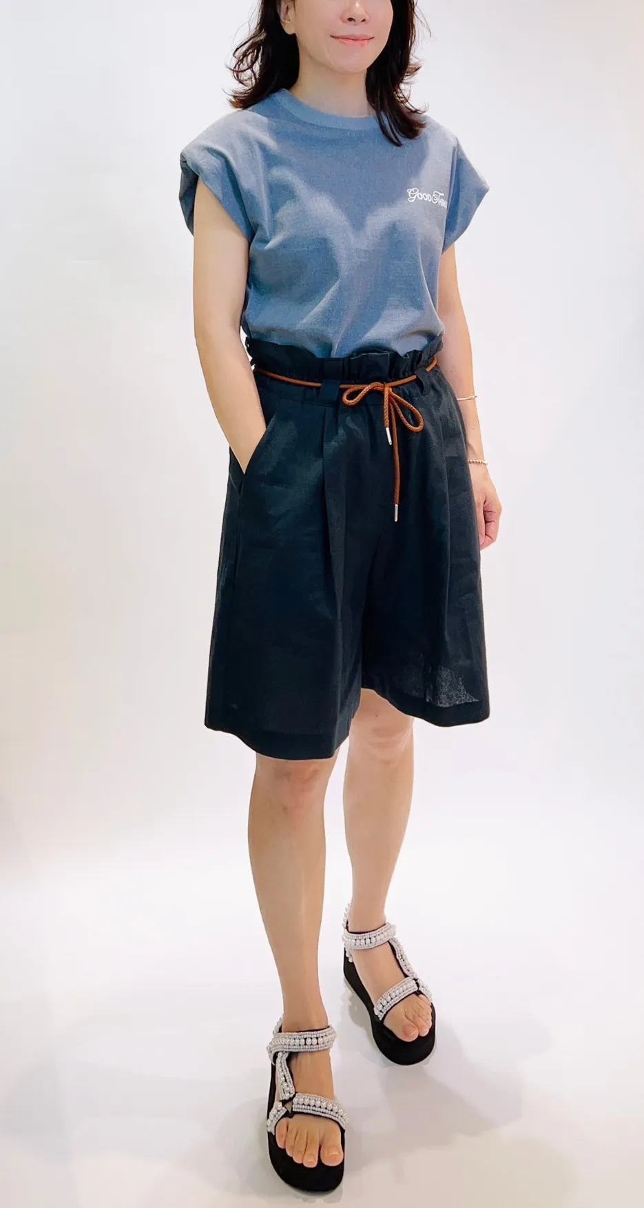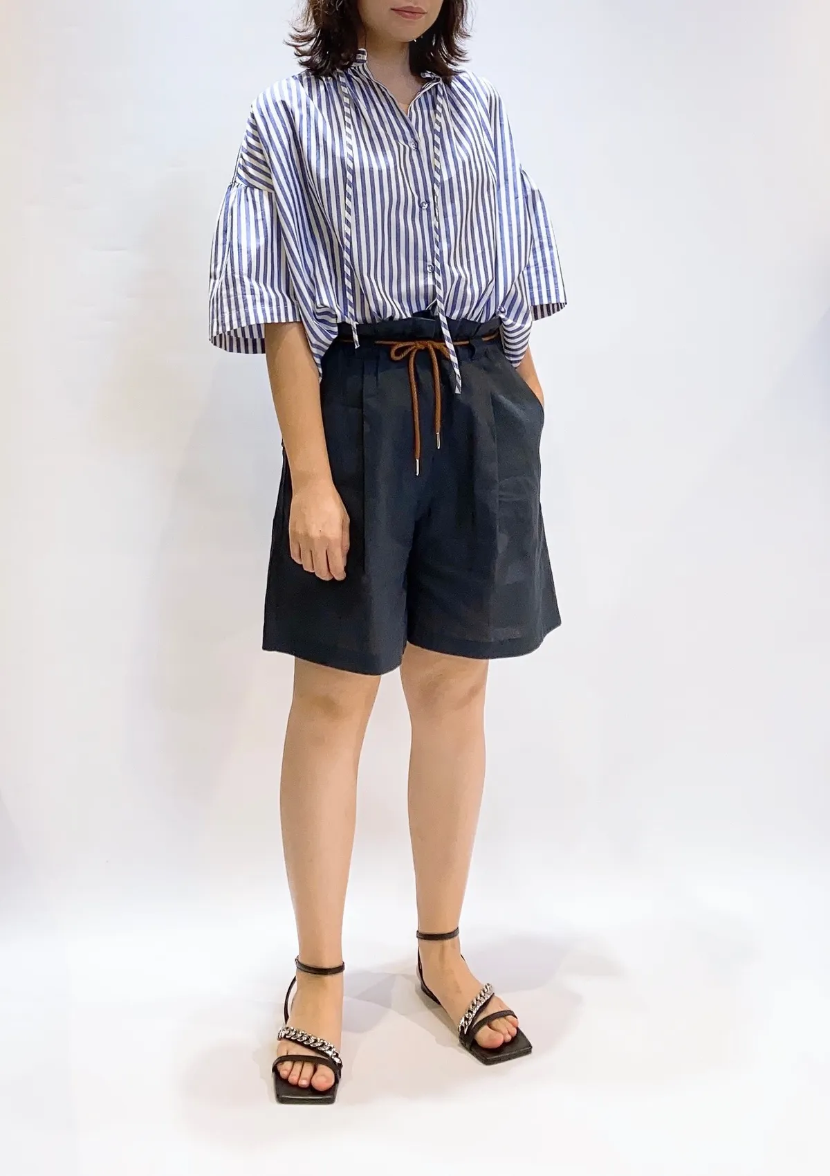 抽繩亞麻五分寬褲
