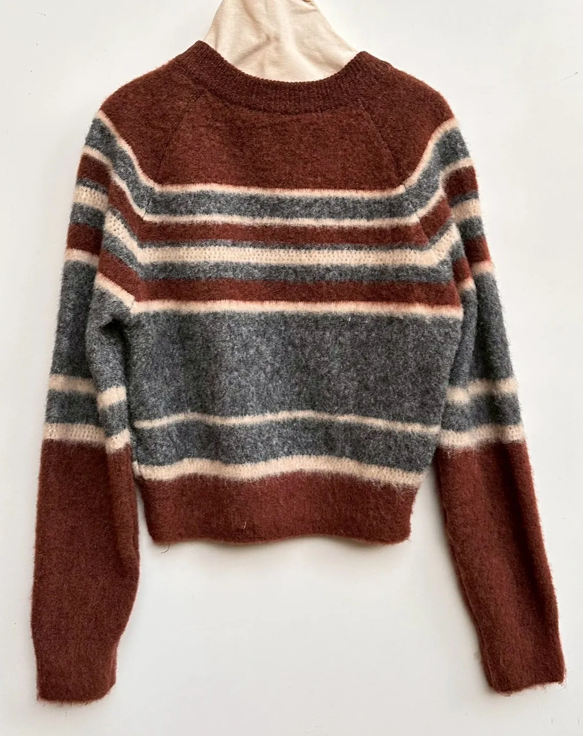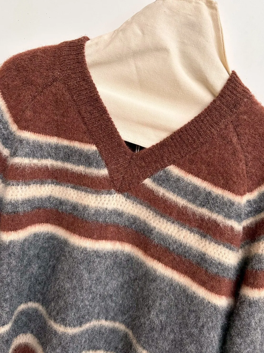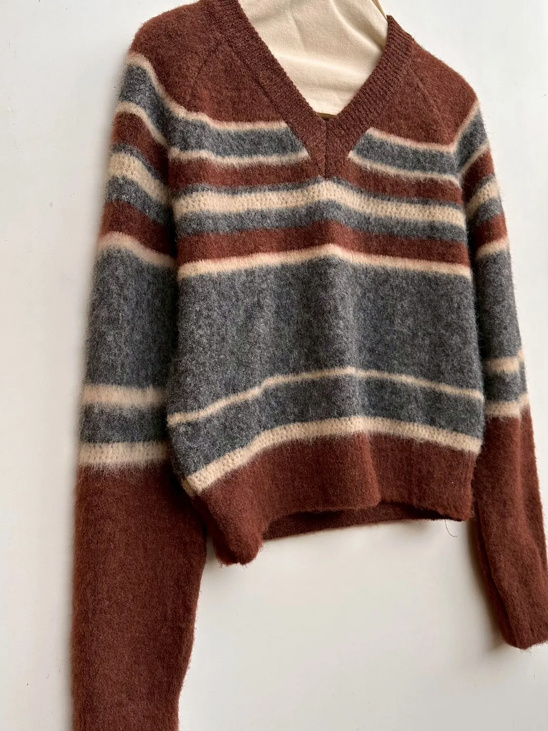 V領橫條鉤花短毛衣